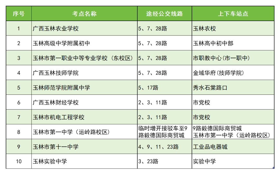玉林市第一中學(運嶺路校區(qū))考點11:00-11:30,16:30-17:00 在考點安排公交車和值勤人員,負責將考生接送到9路毅德國際商貿城站點。