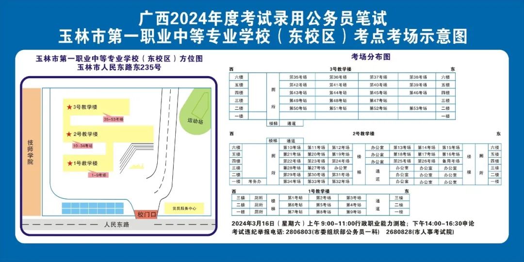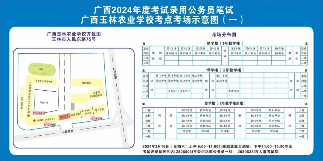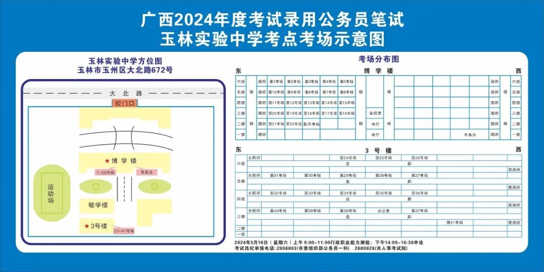 除考試當天考生可以進入考點外,考生不得提前進入考點查看考場(學校將在大門處擺放考場分布示意圖),玉林考區(qū)10個考點的考場布置情況如下: