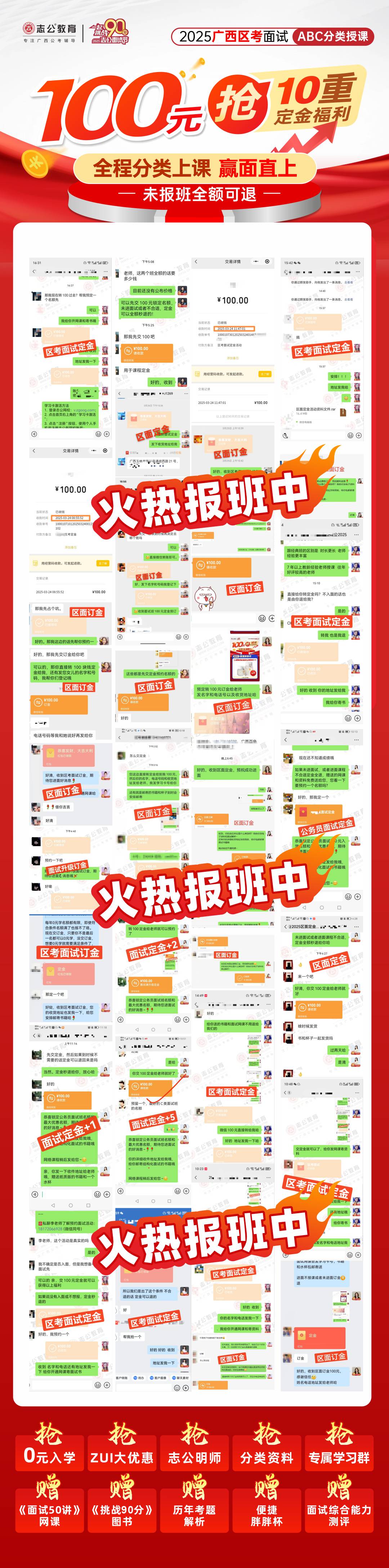 告訴大家個(gè)好消息!志公教育推出了2025年廣西區(qū)考面試ABC分類授課,現(xiàn)在只要100元就能搶到10重定金福利,聽起來(lái)是不是很誘人?