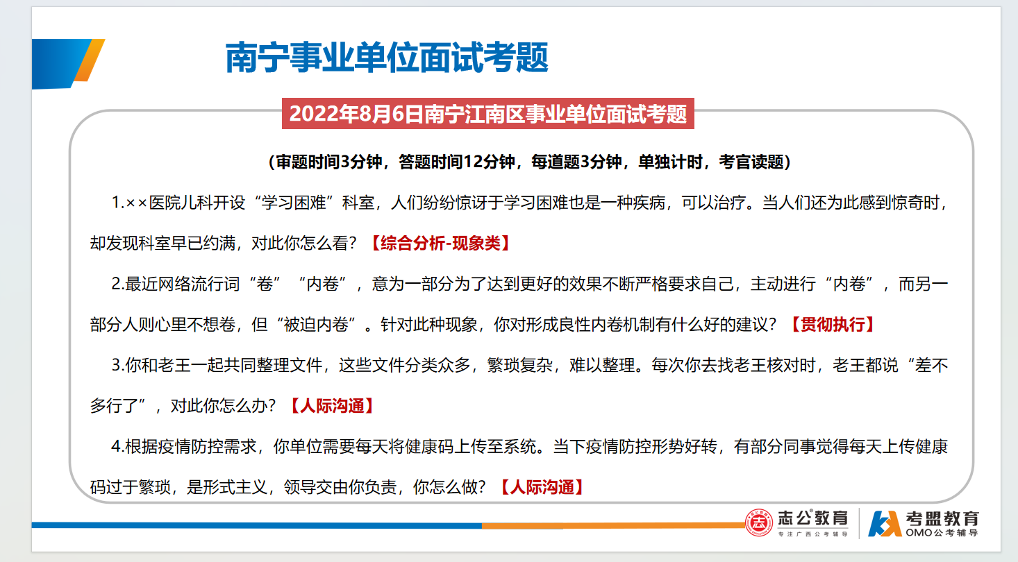 南寧事業(yè)單位面試主要采用結(jié)構(gòu)化面試形式、考查題量有3-4題,答題時(shí)間為9-12分鐘,考查題型:綜合分析(極高)、計(jì)劃組織(極高)、人際溝通(極高)、應(yīng)急應(yīng)變(一般)、貫徹執(zhí)行(一般)、自我認(rèn)知(一般):
