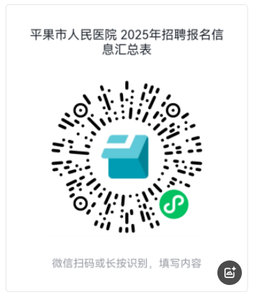 1.填寫(xiě)提交紙質(zhì)版《平果市人民醫(yī)院2025年度公開(kāi)招聘專業(yè)技術(shù)人員報(bào)名表》(附件3),并掃描下方二維碼填寫(xiě)報(bào)名信息。