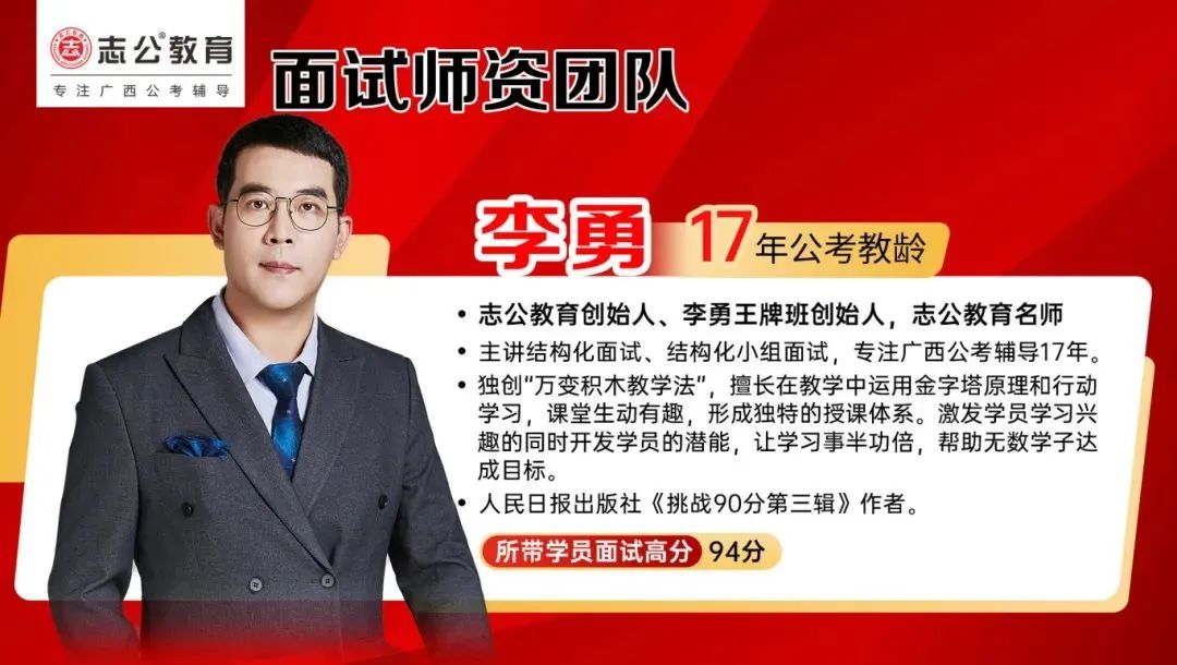 李勇——志公教育創(chuàng)始人、李勇王牌®班創(chuàng)始人,志公教育名師。主講結(jié)構(gòu)化面試、結(jié)構(gòu)化小組面試,專注廣西公考輔導(dǎo)17年。獨創(chuàng)“萬變積木教學(xué)法”,擅長在教學(xué)中運用金字塔原理和行動學(xué)習(xí),課堂生動有趣,形成獨特的授課體系。激發(fā)學(xué)員學(xué)習(xí)興趣的同時開發(fā)學(xué)員的潛能,讓學(xué)習(xí)事半功倍,幫助無數(shù)學(xué)子達成目標(biāo)。同時也是人民日報出版社《挑戰(zhàn)90分第三輯》作者。