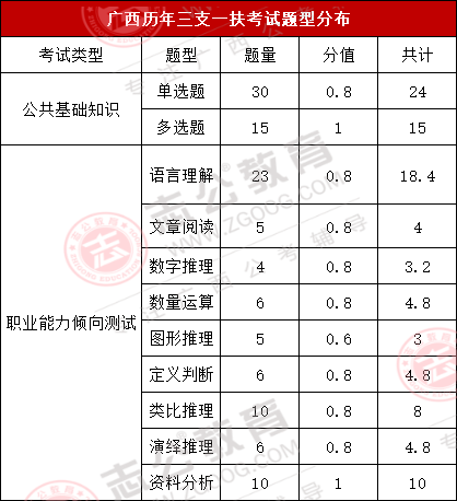 上篇我們寫到,三支一扶的待遇,在廣西這個(gè)待遇還算不錯(cuò),政策上的支持也非常好,那么預(yù)計(jì)這個(gè)月月底出公告的三支一扶,啥時(shí)候筆試呢?2024年廣西三支一扶筆試時(shí)間是7月13日,其筆試科目為《綜合知識》一科,滿分100分。基于往年考生的回憶,綜合知識內(nèi)容主要包括公共基礎(chǔ)知識和行測職業(yè)能力測試兩個(gè)科目,而各題型的題量及分值如下圖所示: