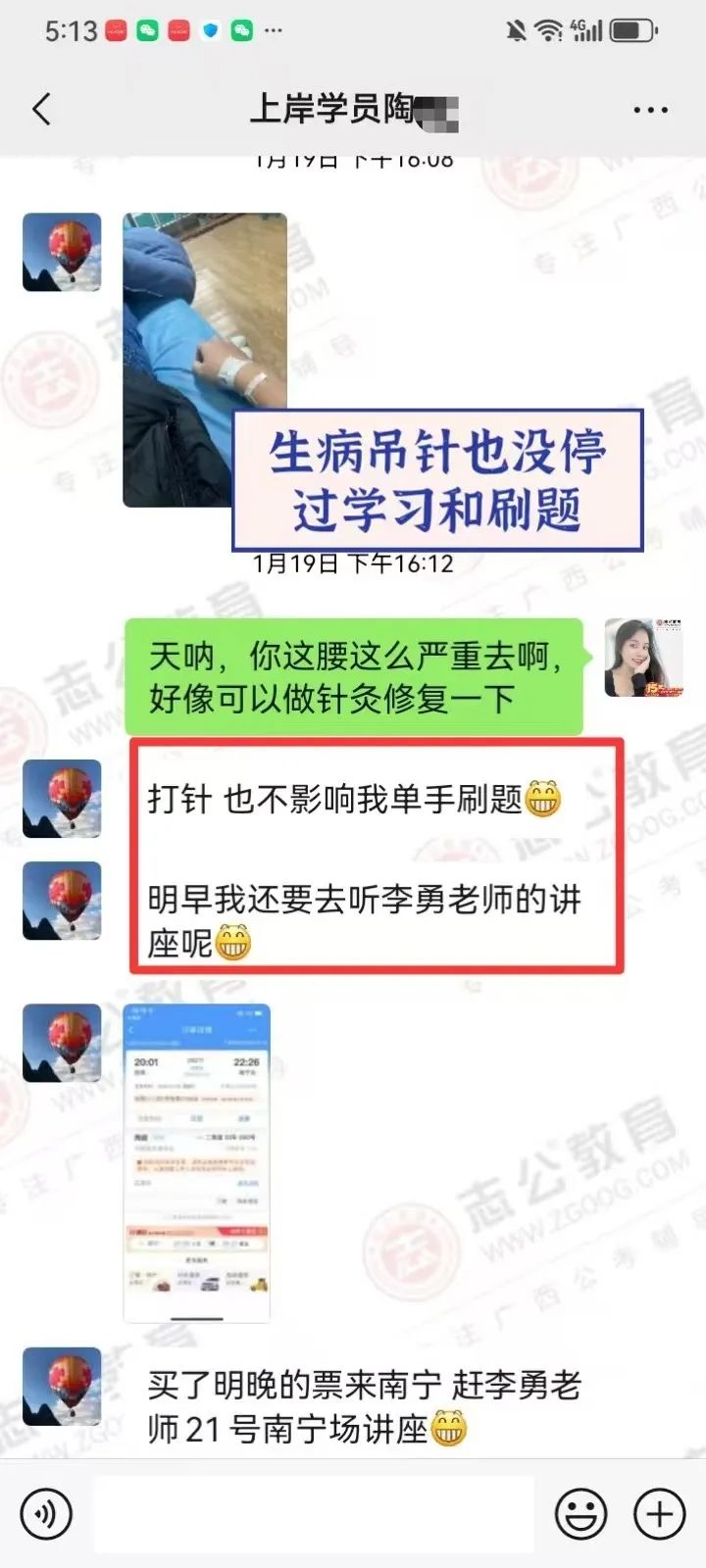 在備考的日子里,無數(shù)個夜晚,我看到他朋友圈發(fā)的經(jīng)常學習練習到教室關(guān)門最后一個才回家,無數(shù)次往返南寧和桂林兩座城市,只為家庭和研究生學業(yè)和公務(wù)員備考的有序進行,讓我印象最深的一次,就是他微信拍了一張正在打針輸液的照片發(fā)給我,還打趣的跟我說:還好不影響我單手刷題! 即使學員因為身體過于勞累導致生病在吊針,也絲毫沒有懈怠過學習,讓我非常的佩服和感動。