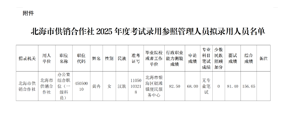 附件:北海市供銷(xiāo)合作社2025年度考試錄用參照管理人員擬錄用人員名單