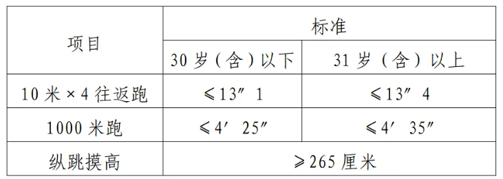 體能測評項目中,縱跳摸高的測試次數(shù)不超過3次,10米×4往返跑測評次數(shù)為2次,1000米/800米的測評次數(shù)均為1次。應聘勤務崗位的人員,體能測評三項全部達標的方為合格;應聘文職崗位的人員,體能測評三項有兩項達標的,視為合格。