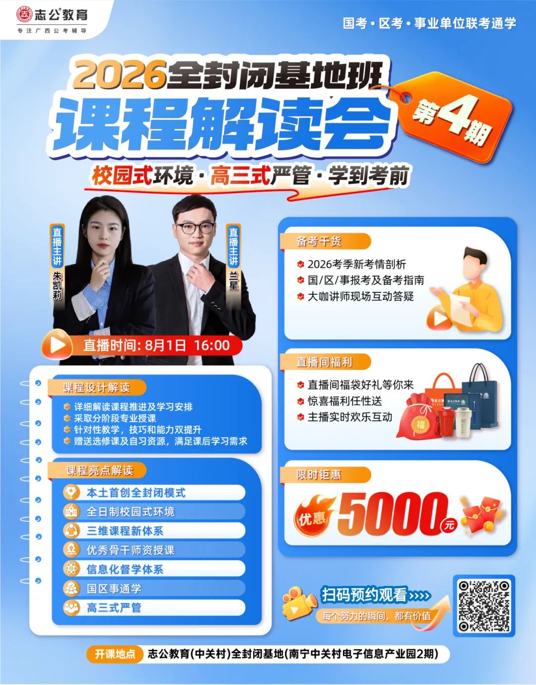 本次解讀會邀請到了朱凱莉、蘭星等資深講師。他們長期深耕公考領(lǐng)域,對廣西的公考形勢了如指掌。在解讀會上,講師們將為大家深度剖析2026考季的新考情、分享報考及備考指南,與同學(xué)們進(jìn)行現(xiàn)場互動,更重要的是進(jìn)行2026年全封閉基地班第4期課程設(shè)計解讀!讓你在備考之初就搶占先機。????