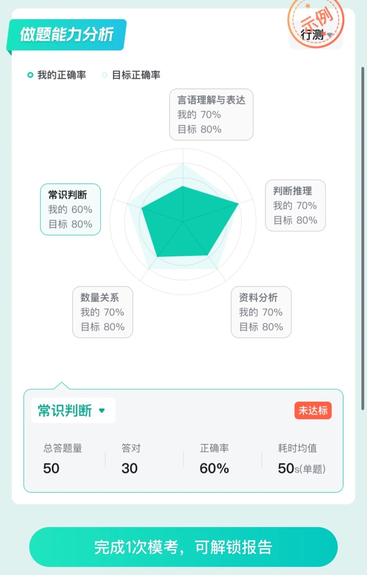 3??生成個(gè)人??紙?bào)告:考完就能查看模考成績、排名及解析,生成的個(gè)人模考報(bào)告包含各模塊正確率分布、做題能力分析、筆試分?jǐn)?shù)yu測(cè)等內(nèi)容。