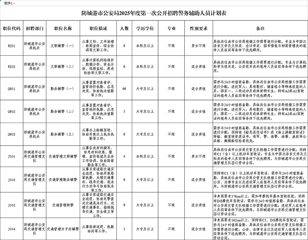 附件:1. 防城港市公安局2025年度第一次公開招聘警務輔助人員計劃表