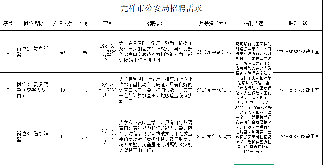 (二) 報(bào)名地點(diǎn)憑祥市公安局(憑祥市北大路69號(hào))報(bào)名及咨詢(xún)電話:0771-8532963報(bào)名投簡(jiǎn)歷郵箱:pxgazgs@163.com報(bào)名請(qǐng)附上身份證復(fù)印件、學(xué)歷畢業(yè)證書(shū)復(fù)印件