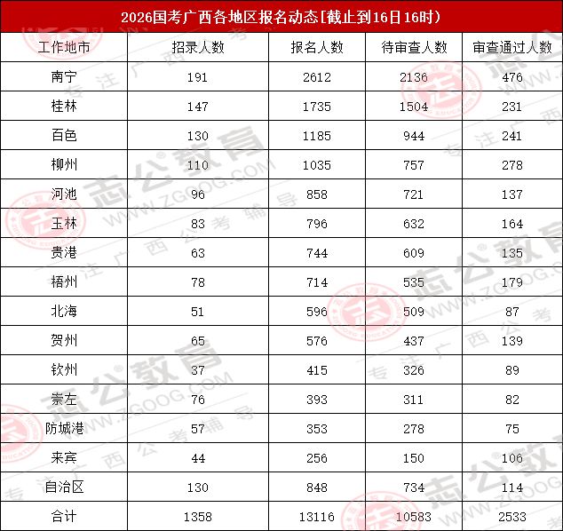 今天是報(bào)名第二天,小伙伴可要抓住此次上/岸機(jī)會(huì)啦!來看看廣西今天的報(bào)名數(shù)據(jù)吧。截止10月16日下午16:00,已經(jīng)有13116名考生報(bào)名,最熱崗220人報(bào)名!從各項(xiàng)數(shù)據(jù)來看,部分考生可能還持觀望態(tài)度。在接下來的報(bào)名時(shí)間里,可能會(huì)迎來報(bào)名人數(shù)大幅增長的情況,大家可以密切關(guān)注。
