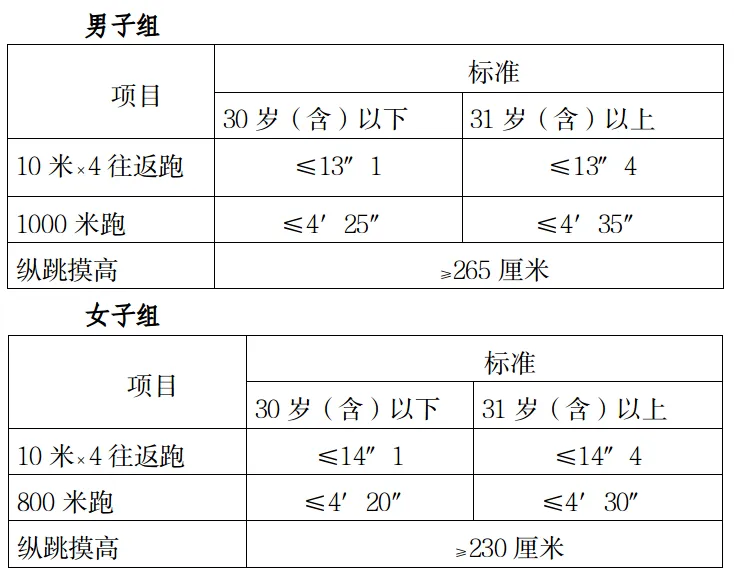 測(cè)評(píng)結(jié)果分為合格和不合格。一般體能測(cè)評(píng)三項(xiàng)成績(jī)均達(dá)標(biāo)的方為合格,其中具有研究生及以上學(xué)歷報(bào)考人員,體能測(cè)評(píng)三個(gè)項(xiàng)目中有任何兩項(xiàng)達(dá)標(biāo)的,即視為合格。體能測(cè)試時(shí)間、地點(diǎn):另行通知。