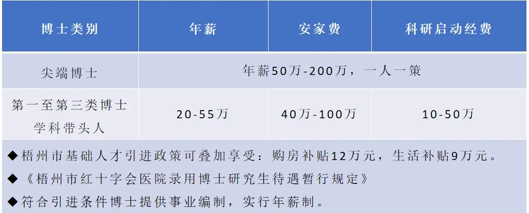 博士研究生學(xué)歷學(xué)位的急需緊缺專業(yè)人才:享受醫(yī)院引進(jìn)博士待遇20-200萬元/年,實(shí)行年薪制待遇一人一議,提供科研啟動經(jīng)費(fèi)10萬-50萬元,疊加享受梧州市人才引進(jìn)補(bǔ)助,安家費(fèi)52-125萬元,生活補(bǔ)貼9-12萬元。
