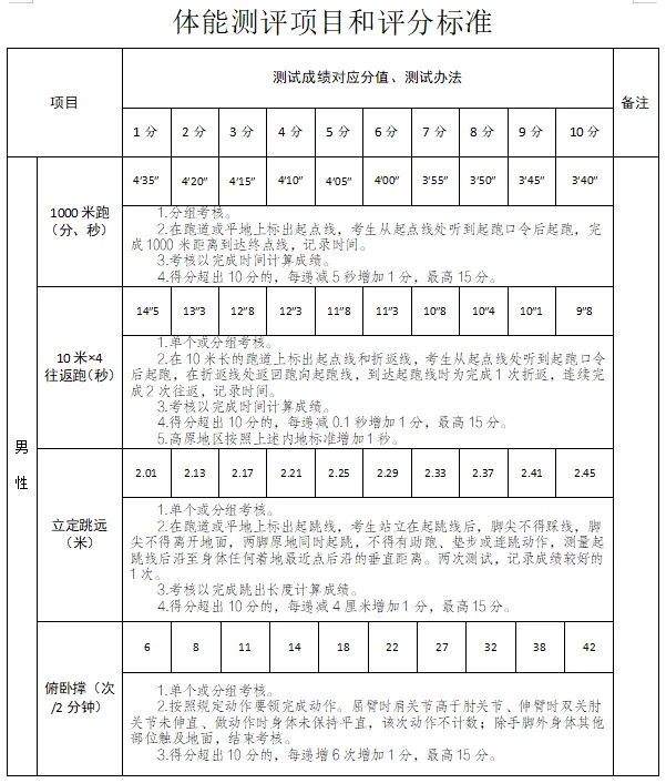 任一單項得分為0的視為“不合格”,予以淘汰。體能測評所有項目均只測試一次。(標(biāo)準(zhǔn)見附件)